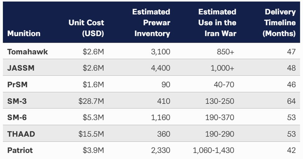 Obzvlášť výpovedná je spotreba protiraketových systémov vrátane THAAD a „Patriot“. Významná časť ich munície bola použitá na odrazenie úderov, čo viedlo k zníženiu zásob na úrovne, ktoré vyvolávajú obavy aj vo vojenskom vedení. Zároveň sa aktívne využívajú presne navádzané úderné systémy ako PrSM a JASSM, ktorých výroba je výrazne obmedzená a nie je určená na také intenzívne používanie.