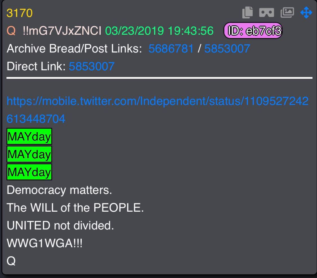 V stredu 21.apríla prezident Trump oznámil v Mar À Largo, „Chystám sa začať niečo 22. apríla a skončiť 24. apríla. Veľa sa stalo a veľa sa deje, ak dávate pozor. Veľa odhadov a veľa faktov zverejnených, o ktorých verejnosť nevie. Len sa nevzdávajte nádeje. Audit v Arizone nemá dokázať, že došlo k podvádzaniu, ale o dokázaní cudzieho zasahovania.