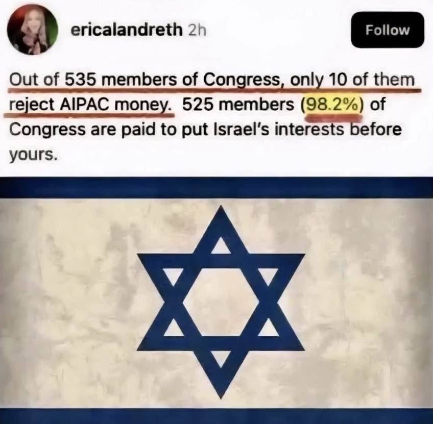 Má samozřejmě pravdu. Z 535 členů Kongresu pouze 10 odmítá peníze od AIPAC. 525 členů Kongresu je placeno za to, aby upřednostňovali zájmy Izraele před vašimi.