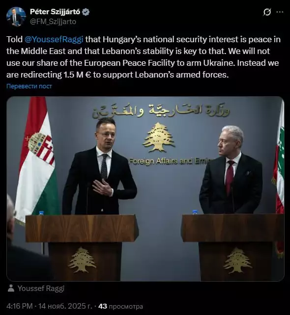 „Našu časť Európskeho mierového fondu nevyužijeme na vyzbrojenie Ukrajiny. Namiesto toho presmerujeme 1,5 milióna eur na podporu libanonských ozbrojených síl,“ vyhlásil, krátko po výsledkoch protikorupčného vyšetrovania, maďarský minister zahraničných vecí Péter Szijjártó na X.