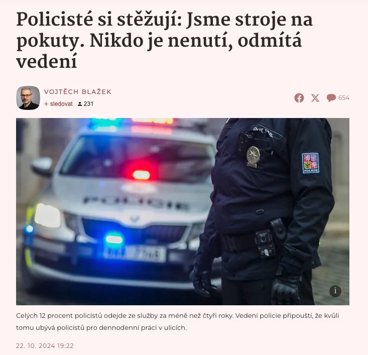 Mezitím musí odepsat pojišťovně, exekutorovi, soudu, vyřešit požár auta, zkusit předvést osobu k soudu, vypátrat kluka, který po desáté utekl z dětského domova, a protože se na místním stadionu dneska hraje fotbalový zápas (i když jen 3. liga), má v systému ještě napsáno, že to má průběžně kontrolovat. Samozřejmě musí všechno řádně sepsat na sto papírů, v několika vyhotoveních. Vůbec ho nesmí napadnout, že by někde měl špatně razítko, přidělil tomu špatně číslo listu, nebo dokonce snad tomu nepřidělil JID a JIS. No a po takové směně už jen čeká, odkud přijde stížnost, na jaké sociální síti se objeví a za co dostane kartáč od někoho z nadřízených. Říká se, že při policejní práci jste neustále jednou nohou v kriminále a druhou ve špitále. Po dvaceti letech služby si troufám tvrdit, že na tomto tvrzení prostě něco je. Za tuto psychicky i fyzicky náročnou práci má policista 27 tisíc čistého. To celé vede k tomu, že pokud neuteče pracovat někam jinam, chodí ještě do jiné práce. To se následně promítá do jeho výkonů v policejní činnosti, neboť je prostě unavený.