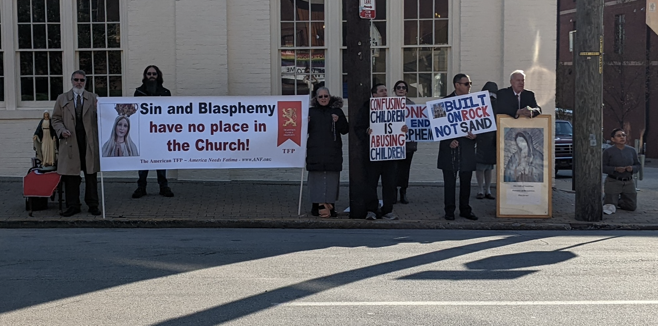 Vonku kostola katolíci usporiadali ružencovú demonštráciu na protest proti tomu, že biskup Stowe’postavil ženu na tribúnu.
