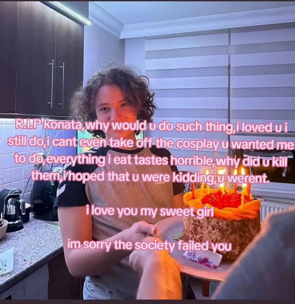„Odpočívej v pokoji, Konato, proč jsi udělala něco takového? Miloval jsem tě a pořád tě miluji. Ani si nemůžu sundat ten cosplay, co jsi po mně chtěla. Všechno, co sním, chutná hrozně.