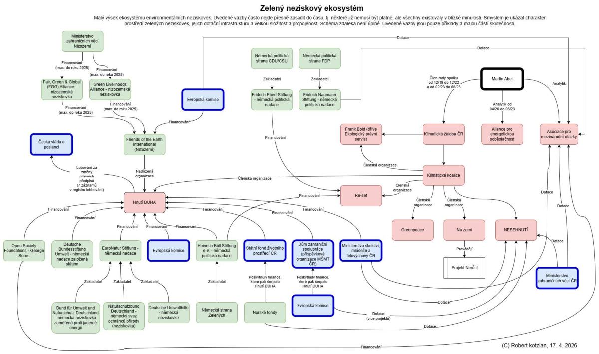 Abel pracoval ve Výzkumném ústavu pro krajinu, což je ústav spadající pod Ministerstvo životního prostředí, které ho také financuje. Zároveň ovšem Abel pracoval v několika ziskovkách, které proti státu otevřeně vystupují, podávají na něj žaloby a snaží se komplikovat jeho rozvoj. Tyto ziskovky jsou financované a to je ta naprostá absurdita, tím samým státem, se kterým bojují a k tomu ještě několika státy okolními, Evropskou unií a desítkami nejrůznějších politických nátlakových organizací, fondů, či dokonce přímo politických stran, ze zahraničí.