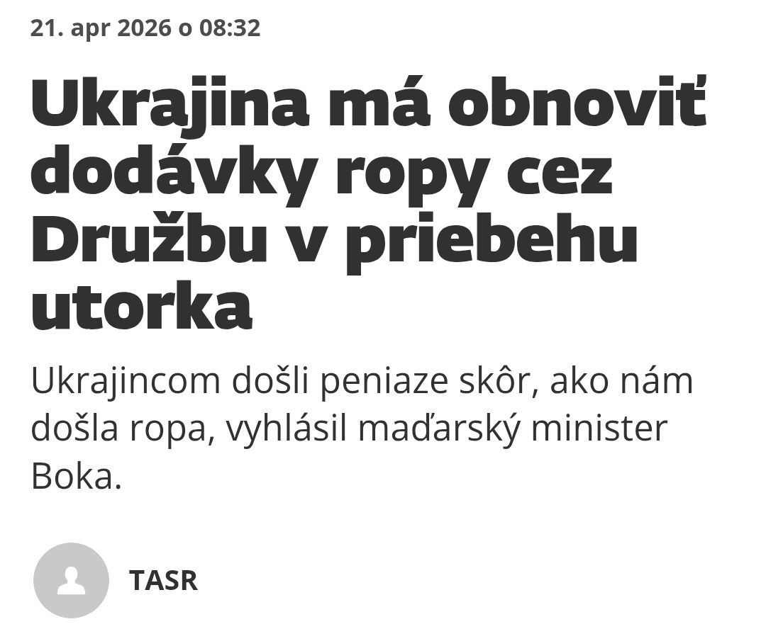 🇺🇦 🇭🇺🇸🇰 Ukrajina obnoví tranzit ropy z Ruska do Maďarska cez ropovod Družba 21. apríla napoludnie, vyhlásil v pondelok (20. 4.) maďarský minister pre európske záležitosti János Boka.