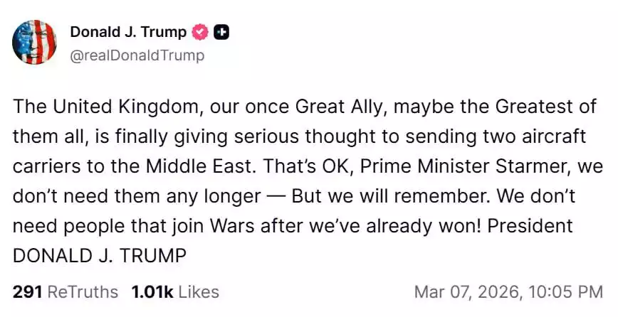 “Spojené kráľovstvo, náš kedysi veľký spojenec, možno najväčší zo všetkých, konečne vážne uvažuje o vyslaní dvoch lietadlových lodí na Blízky východ. No, premiér Starmer, už ich nepotrebujeme – ale zapamätáme si to. Nepotrebujeme ľudí, ktorí sa pridávajú k vojnám až potom, čo sme už vyhrali!”