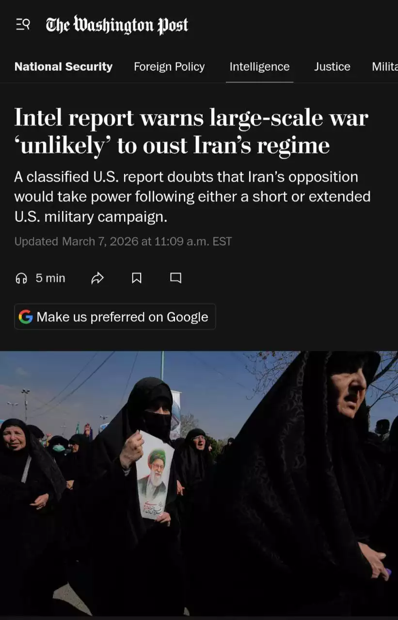 Americká spravodajská služba považuje zvrhnutie režimu v Iráne za nepravdepodobné aj v prípade dlhotrvajúcej vojny. Informuje o tom denník The Washington Post s odvolaním sa na tajnú správu Národnej spravodajskej rady Podľa informácií tohto vydania ani rozsiahly vojenský útok USA pravdepodobne nedokáže odstrániť zakorenenú vojenskú a náboženskú elitu Islamskej republiky. Okrem toho americkí analytici považujú za nízku pravdepodobnosť, že roztrieštená iránska opozícia dokáže prevziať moc v krajine.