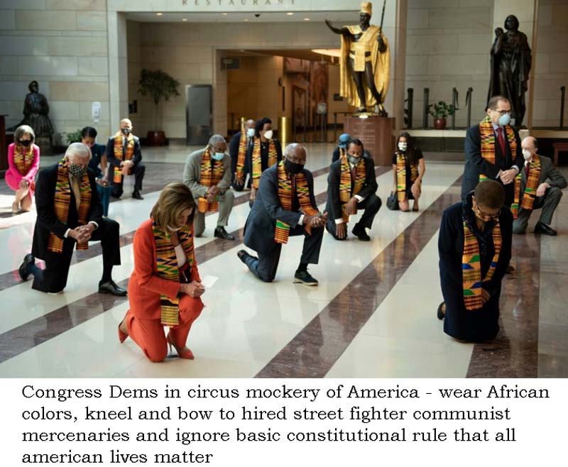 Dokonce i členové demokratické strany v americkém Kongresu poklekli a nechali se přitom i vyfotografovat. Co je na nich zajímavé jsou ty šály. Ty barevné šály jsou totiž vyrobeny z látky, zvané Kente, což je součástí africké kultury ve státě Ghana. Takže tito lidé se vlastně podbízí černochům, nechci to napsat vyloženě sprostě. Někteří černoši jsou ale tímto zjevným patolízalstvím právem pobouřeni.