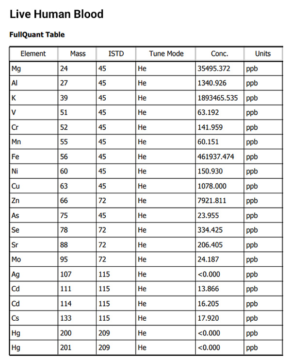 Zde je snímek obrazovky části z PDF zprávy o výsledcích ICP-MS pro živou lidskou krev: