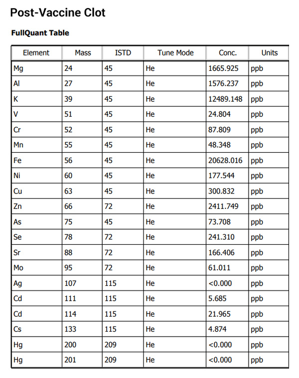 A zde je snímek obrazovky s výsledky analýzy sraženiny, který ukazuje analýzu ICP-MS pro sraženinu po očkování: