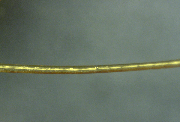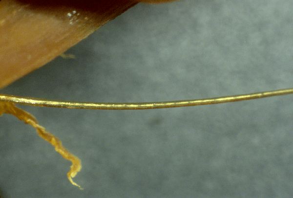 Následující mikroskopický obrázek, pořízený v naší laboratoři při zvětšení asi 1500 x, ukazuje něco, co se zdá být opakující se strukturou na drátovitém výčnělku jedné z těchto sraženin. Pokud by vás to zajímalo, nejedná se o lidský vlas. Je spojen se sraženinou: