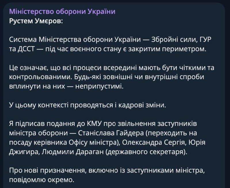 Umerov uviedol, že poslal svojich námestníkov a štátneho tajomníka ministerstva, aby podali demisiu. Ide o Stanislava Gajdera, Alexandra Serhija, Jurija Džihira a Ľudmylu Daraganovú.